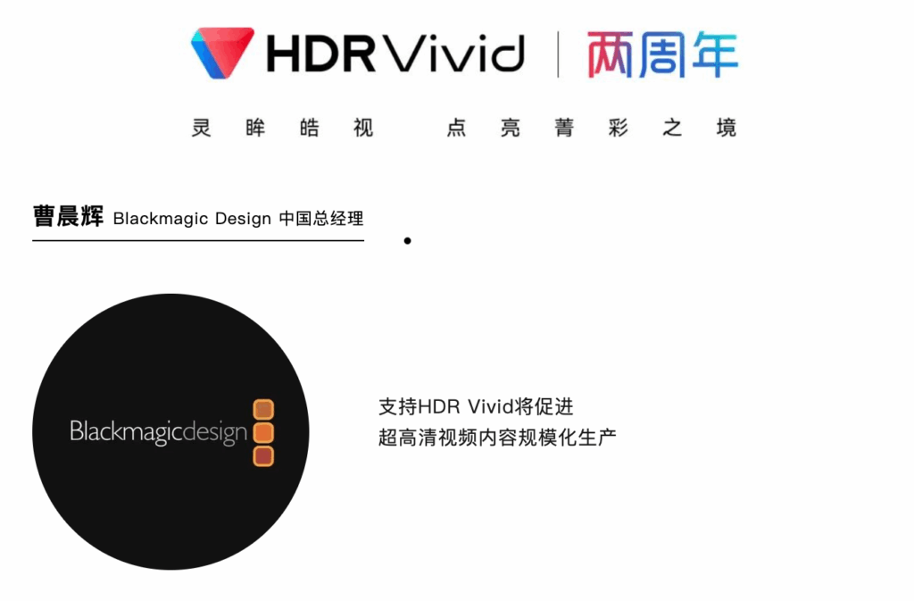 HDR Vivid标准发布后,也得到了海外制作工具厂商的认可与支持。2022 年4月,Blackmagic Design发布了 DaVinci Resolve 18,新版本在Windows、Mac 和 Linux 三大平台支持了 HDR Vivid 标准的功能。DaVinci Resolve 18 提供了包括HDR Vivid在内的元数据设置面板、HDR 模式节点调整、支持ST.2084和HLG HDR色彩映射的色彩空间变换、支持HDR监看的内建示波器。DaVinci Resolve 18 还加入了一个全新的下一代HDR 一级调色面板,支持自定义区域曝光和调色控制,以及感知色彩一致图像处理,让用户可以对HDR 调色进行全面控制。DaVinci Resolve 被世界各地的用户广泛用于众多电影、广告、纪录片、电视剧和音乐电视的制作,如《阿凡达》《变形金刚》《小丑》《阿丽塔:战斗天使》《007 :无暇赴死》等好莱坞巨制,以及《长津湖》《八佰》《我和我的家乡》《邪不压正》《烈火英雄》《妖猫传》《影》《唐人街探案3》等知名华语影片。DaVinci Resolve 18 支持HDR Vivid,将促进超高清视频内容规模化生产。对此,Blackmagic Design中国总经理曹晨辉表示:“如今HDR Vivid 生态发展迅速,越来越多支持 HDR Vivid 视频标准的内容、平台、设备已经出现在消费者的视野中。相信在市场需求和解决方案的推动下,Blackmagic Design与UWA联盟的合作会持续深入下去。”