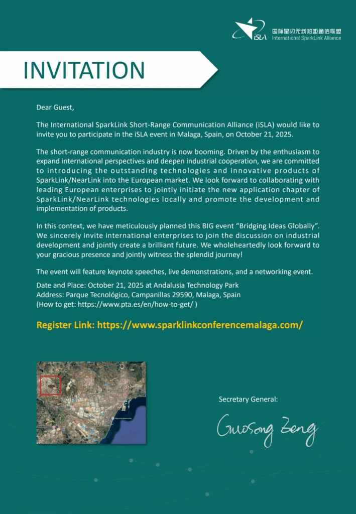 The International SparkLink Short-Range Communication Alliance (iSLA) would like to invite you to participate in the iSLA event in Malaga, Spain, on October 21, 2025.
