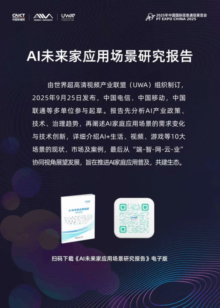 2025年9月中国国际信息通信展期间,世界超高清视频产业联盟发布了《AI未来家应用场景研究报告》(以下简称“报告”)。正值国务院 “人工智能 +” 行动深入实施之际,报告梳理了AI未来家应用场景需求、技术及业务的演进趋势,围绕8大典型场景分析AI带来的变化及商业案例,以应用场景为触点,与产业伙伴共同探讨并推进AI智能家庭业务普惠,共建生态繁荣,共促产业发展。