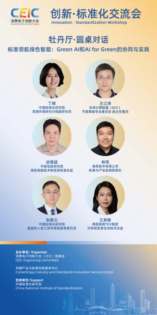 2025年11月7日,在2025消费电子创新大会(CEIC),“创新·标准化交流会”的“标准领航绿色智能:Green AI 与 AI for Green 的协同与实践”圆桌上,中国标准化研究院、全球计算联盟(GCC)、中国电信、海思技术、德国莱茵TÜV的专家们给出了答案的雏形。