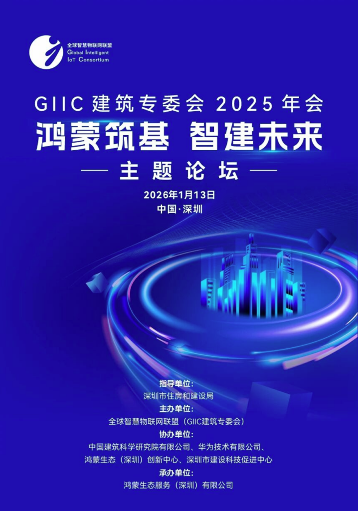GIIC建筑专委会将于2026年1月13日,举办建筑专委会2025年会暨“鸿蒙筑基,智建未来”主题论坛。此次活动聚焦鸿蒙生态与建筑产业的深度融合,特邀行业同仁及合作伙伴齐聚,共同探讨技术创新、标准共建与生态协同,赋能建筑产业高质量发展。