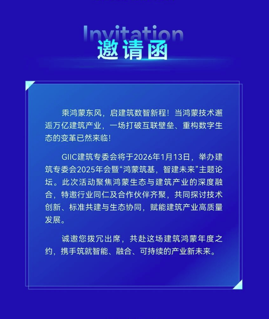 诚邀您拨冗出席,共赴这场建筑鸿蒙年度之约,携手筑就智能、融合、可持续的产业新未来。
