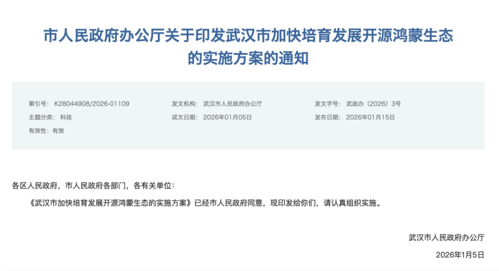 1 月 15 日,武汉市人民政府办公厅正式发布《武汉市加快培育发展开源鸿蒙生态的实施方案》,到 2027 年,武汉市计划落地 100 个开源鸿蒙示范场景,打造 4 款行业级开源鸿蒙操作系统,完成 200 款开源鸿蒙应用软件研发,完成 50 款终端设备开源鸿蒙适配,培育聚集 10 万名以上开源鸿蒙开发者,成为全国重要的开源鸿蒙技术创新和产业创新基地。