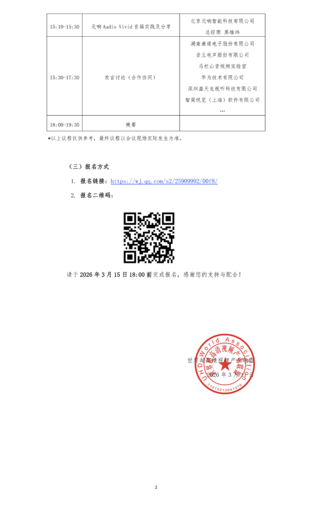 随着菁彩影像HDR Vivid与菁彩声Audio Vivid产业的快速发展,为了更好地推动菁彩声Audio Vivid生态在家庭场景应用,世界超高清视频产业联盟(UWA联盟)特举办UWA联盟2026菁彩声家庭生态研讨会。本次会议核心目标如下: