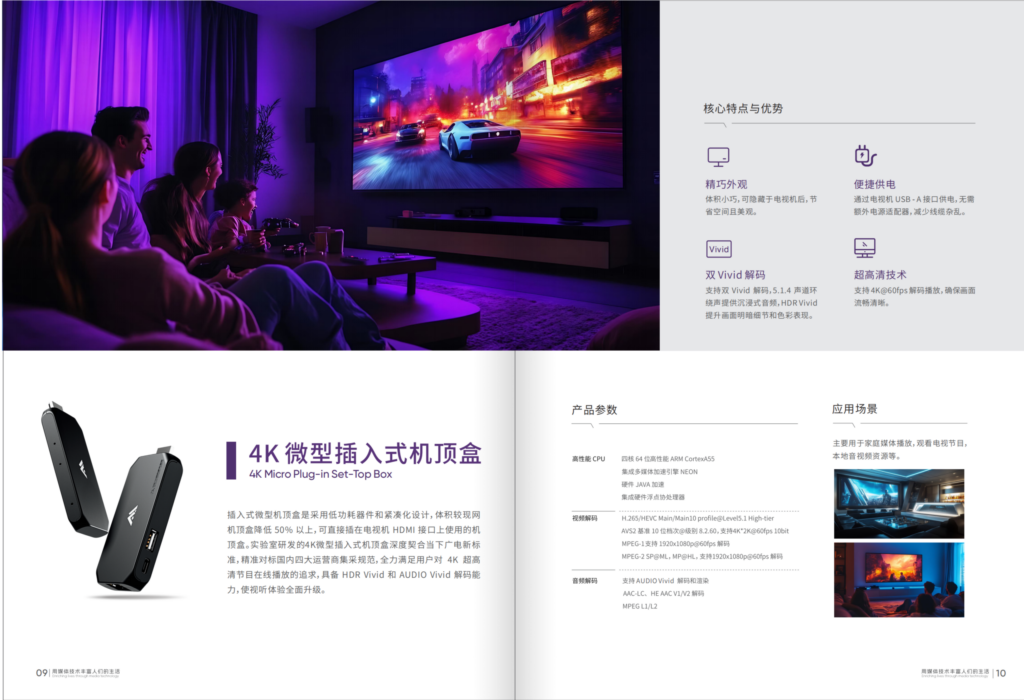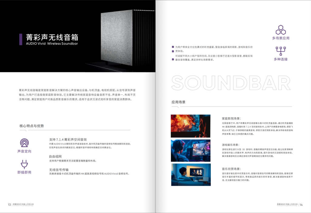 二是模块化灵活适配,降低体验门槛。创新采用多形态硬件组合设计,构建 “按需选择、灵活升级” 的技术适配体系,覆盖不同家庭场景需求。支持双 Vivid 的微型插入式机顶盒,可适配存量显示设备实现老机升级,无需更换整机即可体验菁彩声效果;7.1.4 声道 Soundbar 专注音频体验升级,凭借 Audio Vivid 解码技术打造沉浸式声场;机顶盒 Soundbar 一体机则实现音视频功能集成,简化设备连接。三种方案均基于统一技术架构研发,兼顾独立性与兼容性,让用户可根据家庭空间、预算及需求自由组合,大幅降低菁彩声技术的体验门槛。