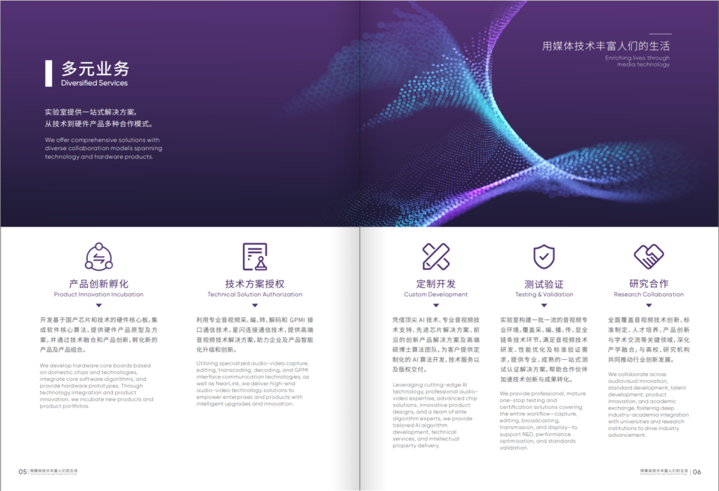 实验室成立以来,聚焦音视频领域的国产化、平民化、底座化,围绕“0-1-10-N”产业关键技术布局,探索基础与前沿技术,孵化创新应用场景,赋能产业升级。业务主要覆盖音视频产业生态发展、技术研究、产品创新、AI应用使能等,已布局个人终端、家庭、车载、内容、标准等五个领域展开技术研究和产品创新,累计提交发明专利申请200余项,参与标准制定60+项、提交提案 100+篇,打造10余个重点产品和解决方案。