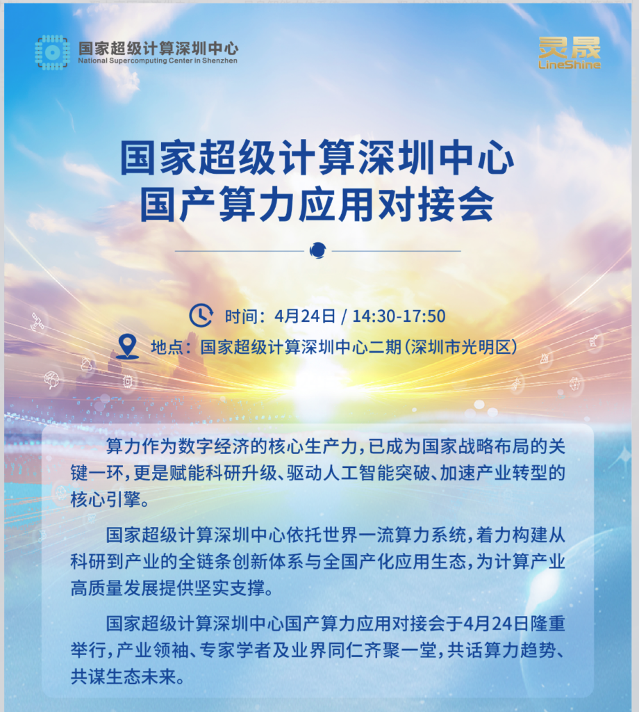 盛会将至!国家超级计算深圳中心国产算力应用对接会明日正式启幕。诚邀各界产业同仁、生态伙伴齐聚深圳,共探国产算力创新应用。