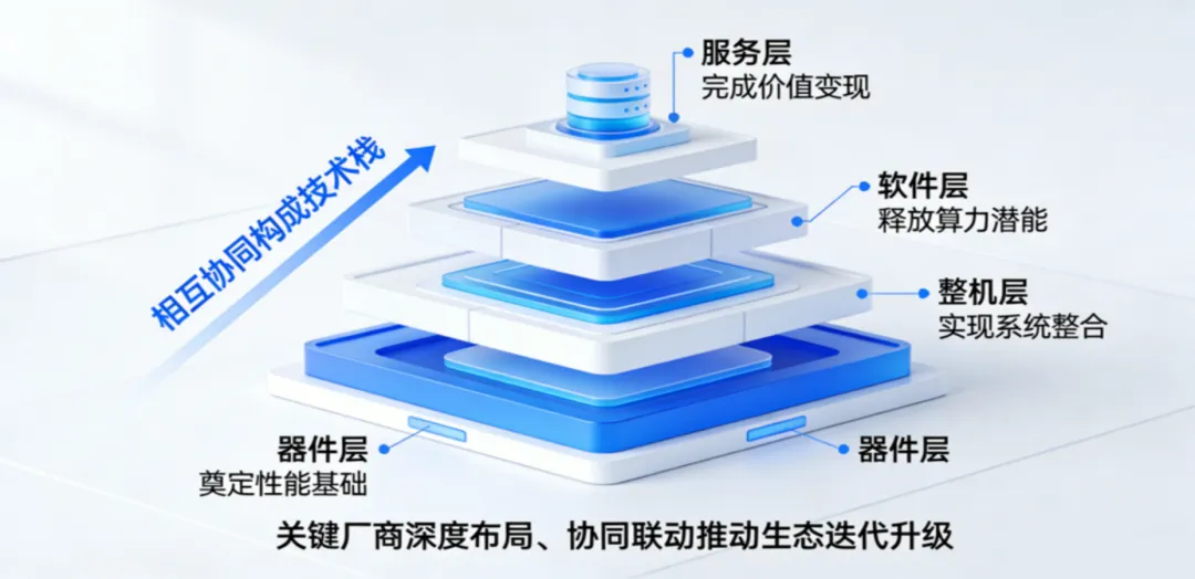 从超节点的体系架构出发,其生态体系可划分为四层技术栈,自底向上依次为器件层、整机层、软件层、服务层,各层级通过协同联动构成完整的技术体系。
